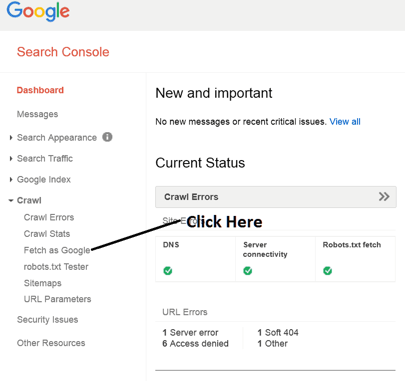 Once you are in “manage property” console click on the “Crawl” and then “Fetch as Google”: